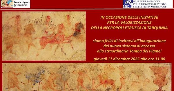 TARQUINIA - L’associazione Amici delle Tombe di Tarquinia, in collaborazione con la Soprintendenza per la provincia di Viterbo e per l’Etruria meridionale, in occasione delle iniziative per la valorizzazione della Necropoli etrusca di Tarquinia, ha organizzato per giovedì 11 dicembre prossimo, l'inaugurazione del nuovo sistema di accesso alla straordinaria Tomba dei Pigmei, realizzato grazie al generoso contributo della Socia Federica Wiel Marin e, fino ad oggi, difficilmente accessibile a causa del lungo e ripido dromos. L’appuntamento è alle ore 11 al parcheggio della Tomba dei Tori. L’ingresso sarà contingentato e gratuito, senza obbligo di prenotazione. Alla fine è previsto anche un brindisi per festeggiare l’evento: un importante intervento volto a garantire una maggiore fruibilità e accessibilità di un sito così prestigioso.