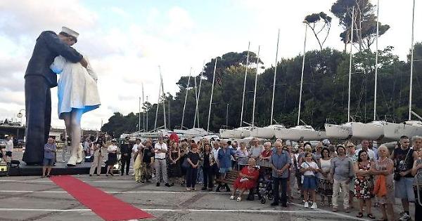 L"Embraching Peace" sembra essere diventato invisibile, messo lì, al centro del parcheggio del porticciolo, tra quattro fioriere e due panchine. Non un faro ad illuminarlo, non un depliant che lo promuova, non un gadget che lo ricordi. Un bacio solitario.