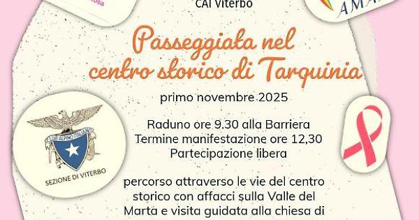 TARQUINIA - Il Cai, sezione di Viterbo, nello spirito improntato alla solidarietà che contraddistingue l’operato dei propri soci, invita alla partecipazione a alla camminata rosa, «importante manifestazione che si svolgerà in collaborazione con le associazioni del territorio”: "Tarquinia in Rosa" e Aman, (Associazione miglioramento assistenza e cura malati neoplastici). Scopo della manifestazione è la sensibilizzazione nei confronti della prevenzione dei tumori alla mammella. L'appuntamento è alle 9,30 di sabato primo novembre presso la Barriera di San Giusto da dove avrà inizio la passeggiata per il centro storico, sponsorizzata dalla Asl di Viterbo e dal Comune di Tarquinia. Il percorso si snoderà attraverso le bellissime strade del centro storico, con affacci sulla Valle del Marta ed una visita guidata alla stupenda chiesa di Santa Maria in Castello che verrà aperta per l'occasione. La chiesa, del periodo romanico, è il più rappresentativo esempio di architettura religiosa della città. Il percorso si svilupperà per 2,2 chilometri, con un dislivello positivo contenuto a soli 60 metri. La manifestazione avrà termine intorno alle 12.30. La partecipazione libera è aperta a tutti.