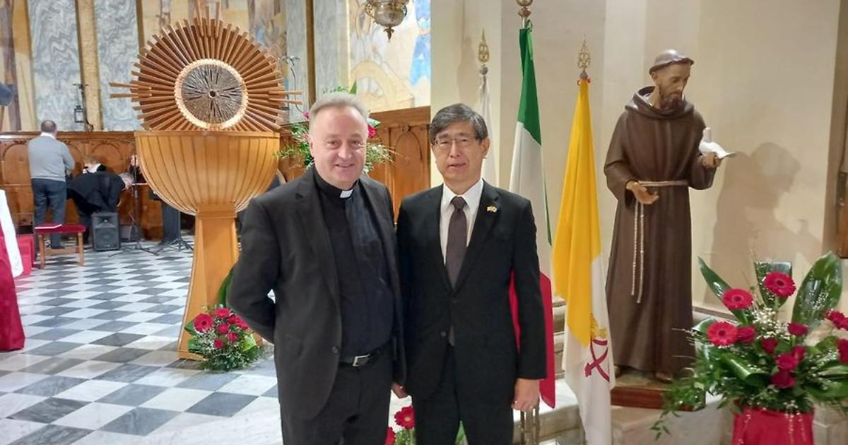 Particolarmente sentite le parole di ringraziamento rivolte a Sua Eccellenza l’Ambasciatore Akira Chiba, giunto al termine del suo mandato (nella foto con don Giovanni Demeterca). «Desidero esprimere la mia gratitudine – afferma don Giovanni – a un diplomatico di grande spessore umano e spirituale, con cui ho avuto il piacere di condividere numerosi momenti culturali e religiosi. La sua presenza è stata un dono prezioso per la nostra comunità e per il legame di amicizia tra i nostri popoli».